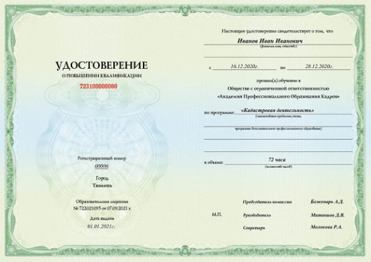 После завершения обучения выдается комплект документов: удостоверение о повышении квалификации.